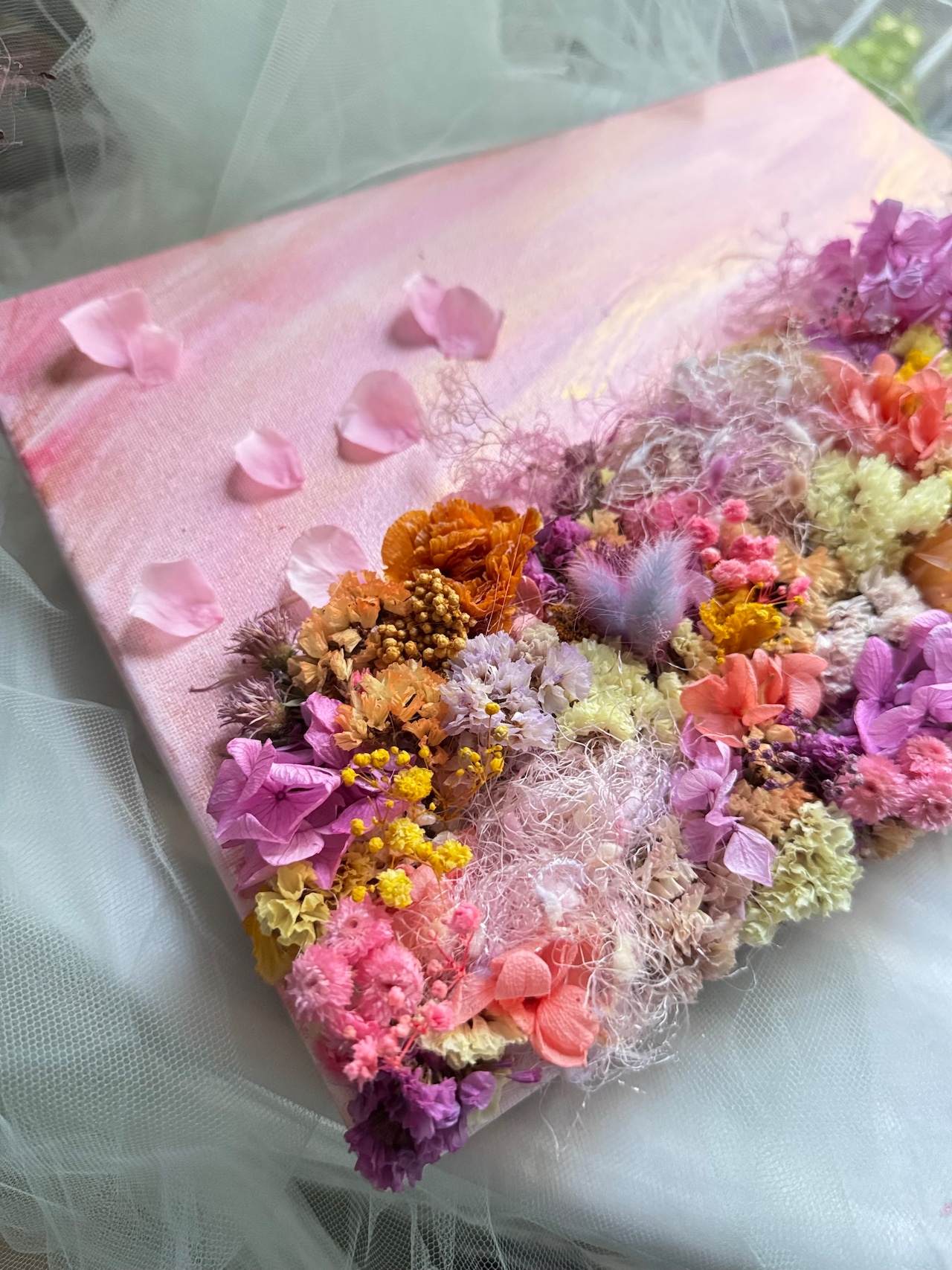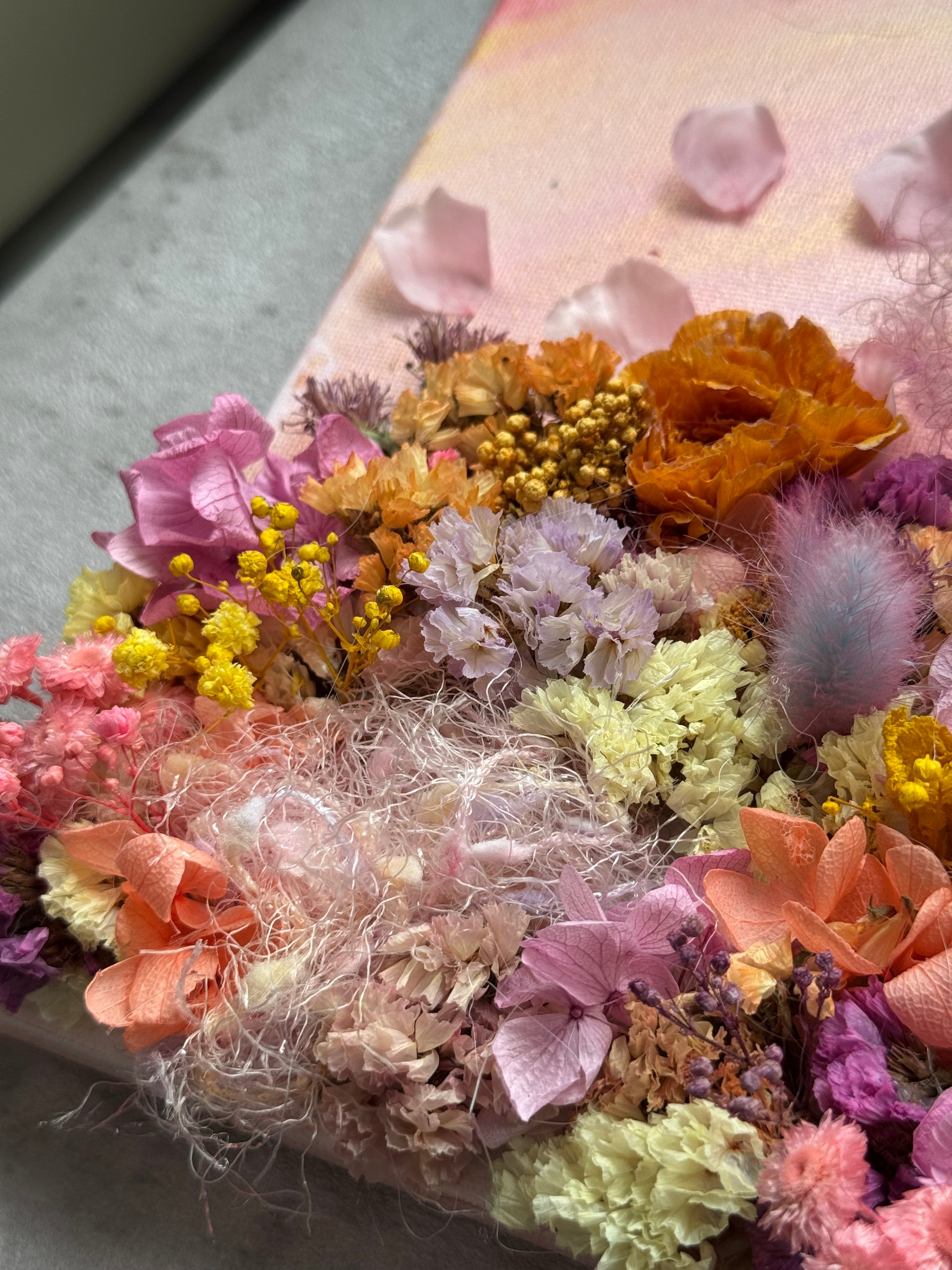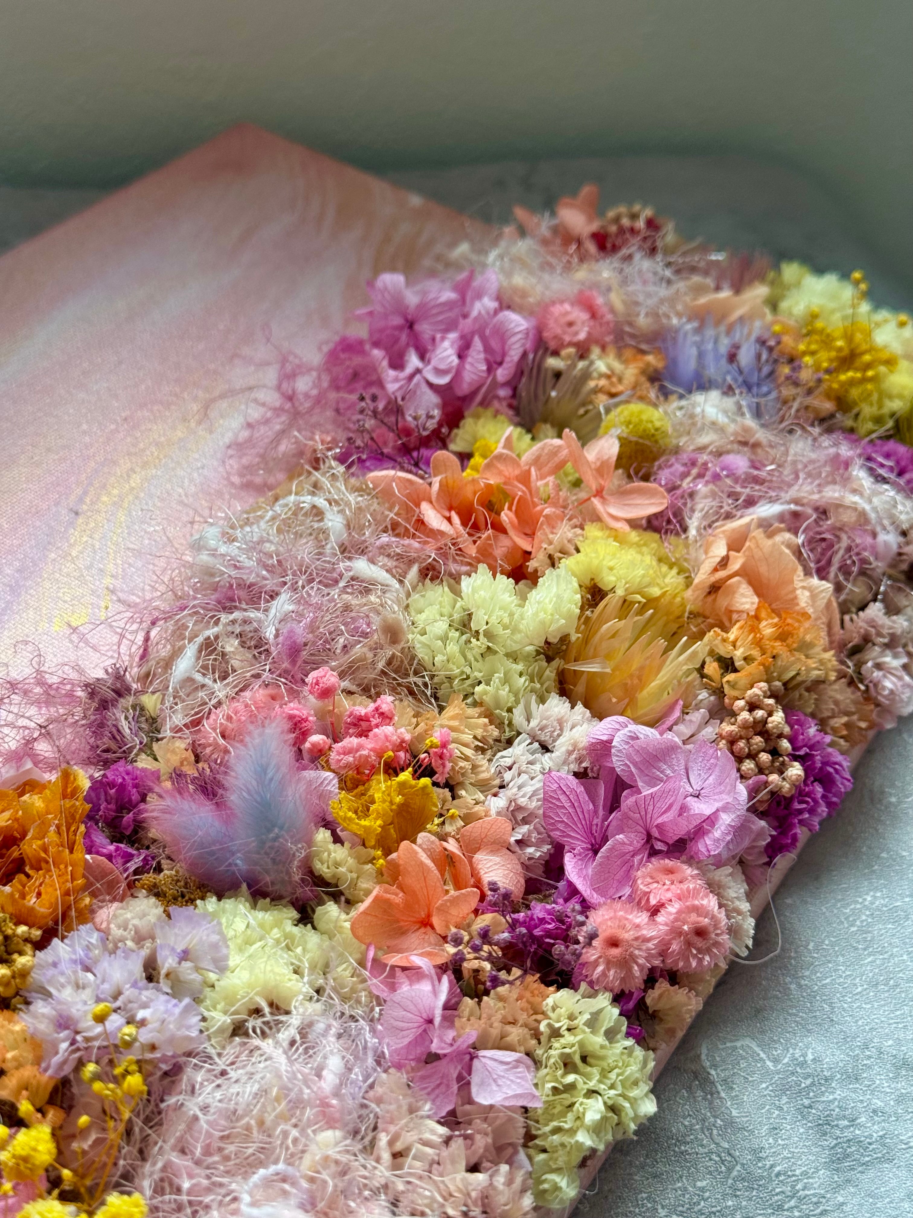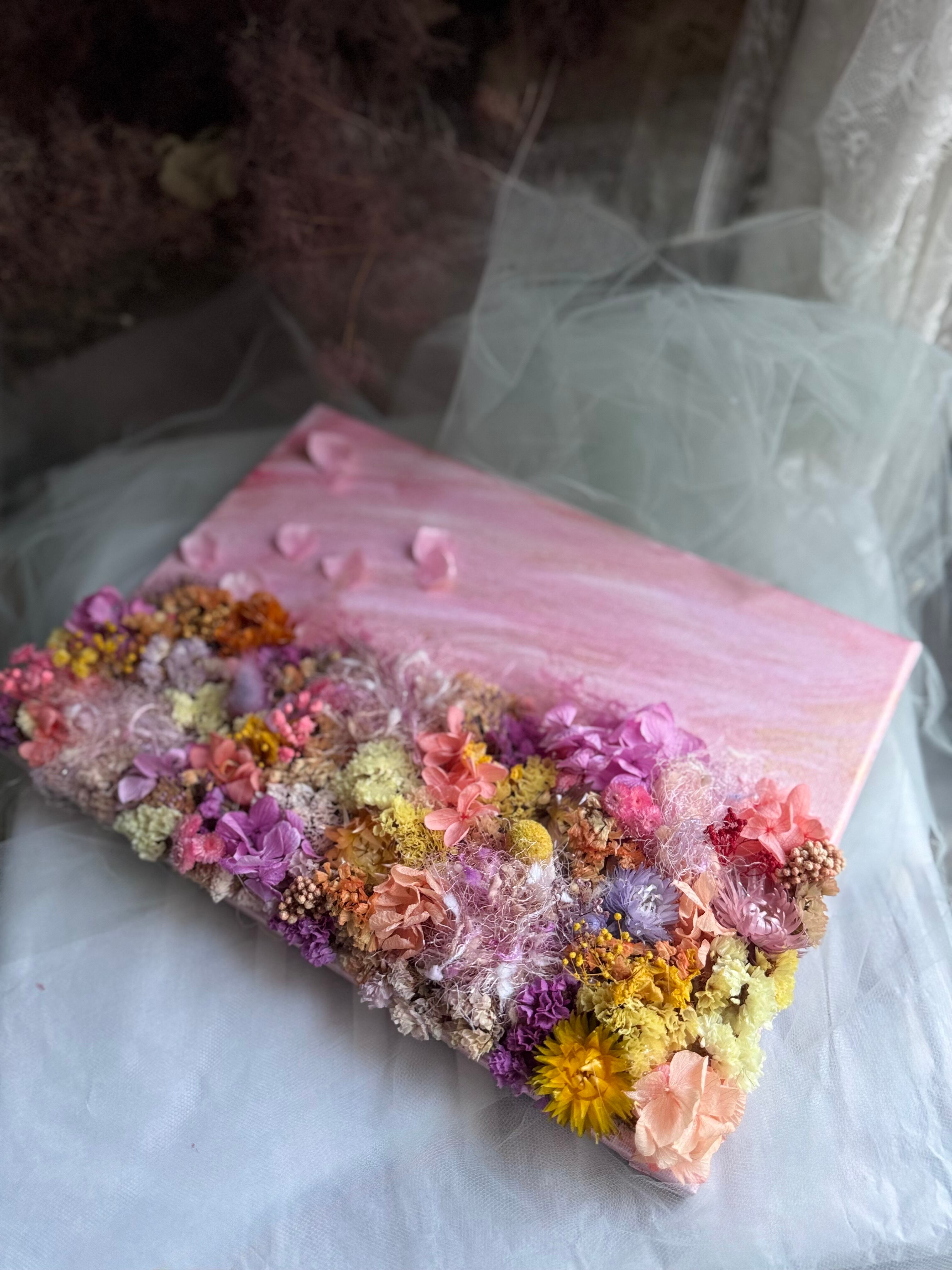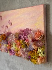 ゴールドとピンクのグラデーションで色を染めて、アンニュイカラーのモヘア糸と陽の気を放つ色合いのドライフラワーで一枚の絵の様にデザインしたオリジナルのガーデンキャンバスです。